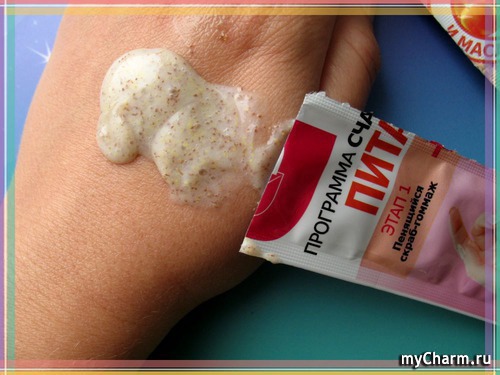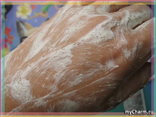 Для этого нужно разделить пакетик на две части.Сначала, естественно принимаемся за использование скраба. Выдавливаю немного на руку. Сразу чувствуется аромат, по большей части смородиновый. Немного отдает и персиком, но в основном запах все же косметический, нежели натуральный. В целом, неплохой.