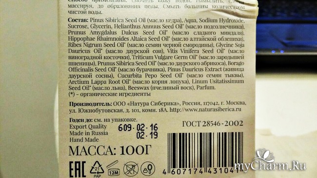На коробке можем найти все то, что интересует нас про мыло (МАССА 100 г; Срок годности: 3 года с даты производства и 1 год после открытия; Ручная работа; Сделано в России; Экспортное качество).