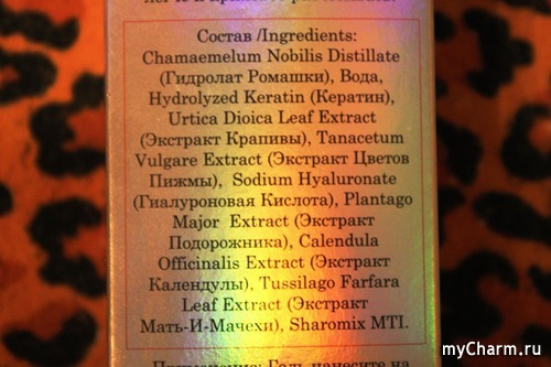 Кератин от Gemene упакован в красивую и изящную упаковку. Гладкая серебристая коробочка переливается всеми цветами радуги в лучах света. Она украшена тонкой золотой цепочкой. Верхний открывающийся клапан заклеен плотной прозрачной этикеткой, которая свидетельствует о новизне продукта. Имеется описание действия, рекомендации по применению и состав на двух языках. Кстати, состав просто изумительный. Это коктейль из кератина, гуалуроновой кислоты и экстрактов растений (крапива, цветы пижмы, календула, подорожник и мать-и-мачеха). Никакой экзотики и сомнительных компонентов - все знакомое и родное. О чем еще можно мечтать?