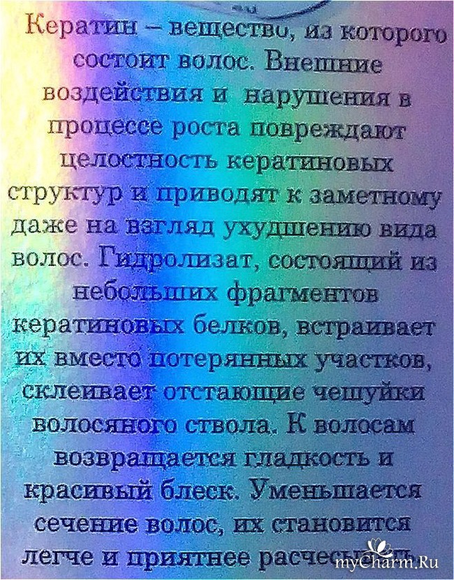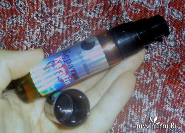 Внешний вид продукта, обещания производителя. Открыв посылку, обнаруживаю, что Кератин находится в красиво оформленной коробочке, переливающейся всеми цветами радуги. Коробочка также оформлена красивой позолоченной цепочкой, внутри упаковки находится симпатичный рисунок и перегородка, чтобы удерживать флакон. Само средство заключено в коричневого стекла карандаш с дозатором, что очень удобно при использовании – сразу видно, сколько средства еще осталось внутри флакона.