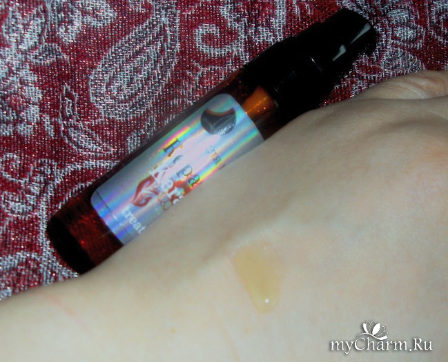 После мытья волос со своим шампунем наношу на волосы Кератин. Мне, с длиной волос до плеч хватает 3-4 нажатия на дозатор. Думаю, расход средства каждый для себя подбирает индивидуально, но все равно при объеме флакона 30 мл его хватает достаточно надолго, мне так уж точно! После фена сразу чувствуется, что волосы становятся более послушными, легче расчесываются и не магнитятся, к ним приятно прикасаться. Само средство имеет слегка выраженный травяной запах, практически бесцветно, в меру жидкое. Запах очень ненавязчивый, думаю, это многим понравится. При разовом нажатии на дозатор появляется вот такое количество средства: