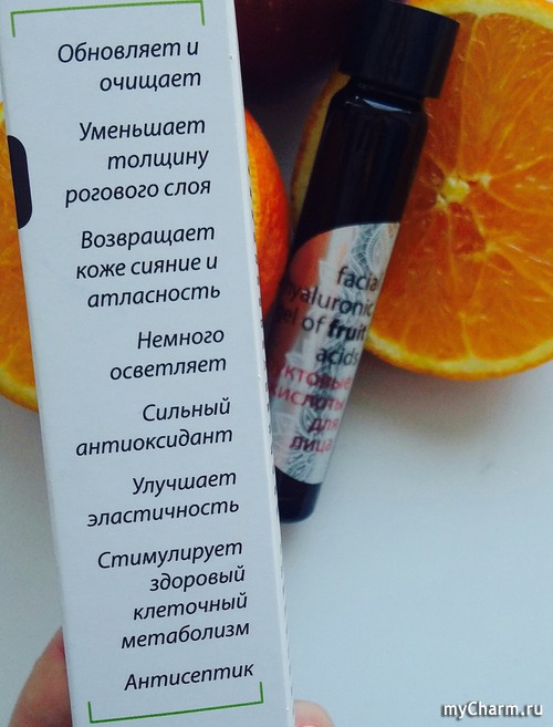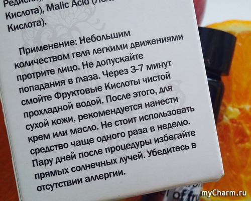 Итак, что касается результата применения фруктовых кислот, то некоторые улучшения в состоянии кожи я заметила! Применяла гель я на протяжении двух месяцев, один раз в неделю, хотя иногда получалось раз в 5-6 дней. Небольшое количество средства я наносила на очищенную и увлажнённую гидролатом кожу, избегая области вокруг глаз. Сразу после нанесения, кожу стягивает, но при этом не сушит! Примерно через 10 минут я смываю кислоты с лица. На утро, после такой процедуры, кожа очень нежная, гладкая и подтянутая. После двух месяцев применения, я заметила, что гель здорово разглаживает межбровную морщинку, к тому же носогубные складочки становятся менее выраженными. К сожалению, существенного воздействия на поры я не отметила, хотя очень хотелось бы :) Текстура и цвет кожи улучшаются, и она действительно выглядит свежей и здоровой! Однозначно, периодически следует применять такой комплекс в уходе за кожей, чтобы как можно дольше сохранить её молодость. Объема в 26 мл хватит как минимум на 2 двухмесячных курса, а цена при этом очень приятная! Тем, кто ещё не знаком с этим средством, советую пополнить им свой арсенал! :)
