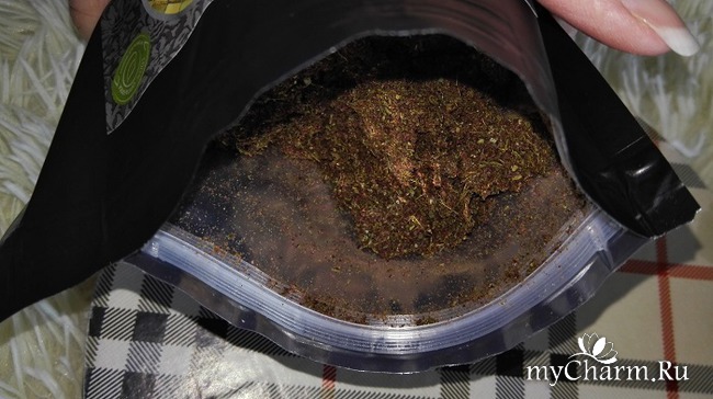 Как видите, травяной скраб лежит в пакете, материал напоминает плотный полиэтилен. На пакетике есть специальные насечки, для ориентира, чтоб на этом месте отрезать кромку.