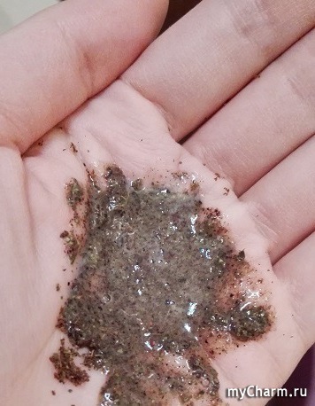 Сам скраб представляет собой смесь перемолотых листьев и ягод. Крупинки довольно мелкие и очень нежные. Приятно их трогать и сжимать в руках.