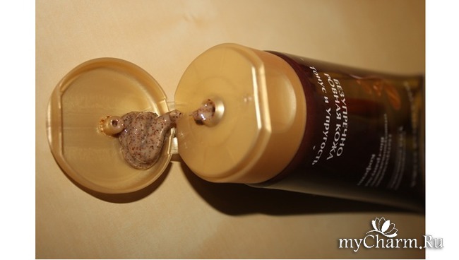 Скраб достаточно густой. Нужно немного нажать на тубу, чтобы извлечь необходимое количество. Кстати, используется достаточно экономно. Наношу на влажное тело и круговыми движениями растираю по телу. Он не пенится, но отлично растирается, словно в основе крем или йогурт)) Темные частицы скраба не травмируют кожу, они «работают» очень деликатно и приятно.
