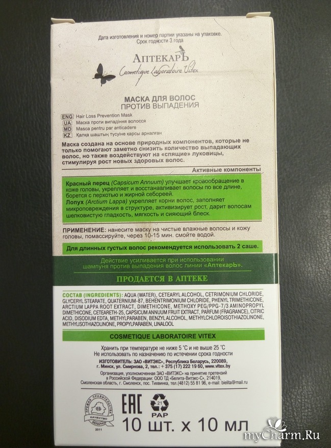 Маска подходит для всех типов волос. Описание очень привлекает (не буду перечислять, все указано на упаковке). Основными ингредиентами является красный перец и лопух. Кстати, красный перец не только улучшает кровообращение, но и борется с себореей и перхотью. Ну об полезных свойствах лопуха, я думаю наслышаны все (в нем содержатся полезные эфирные масла, белок, крахмал, витамины групп А, В, С, D, Е). Помимо этих компонентов, других интересных ингредиентов нет, но и этих я думаю достаточно. Больше - не значит лучше.