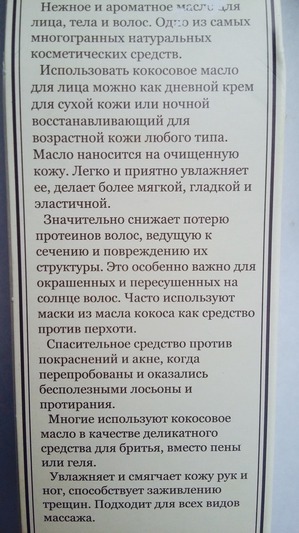 Для применения по вышеописанным предназначениям нужно совсем небольшое количество кокосового масла, и расходуется оно, соответственно, очень экономично. Как правило, у меня не возникает необходимости смывать кокосовое масло с кожи.