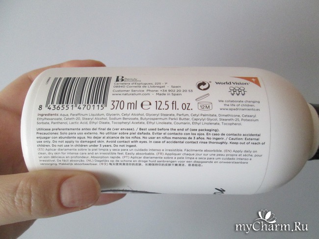 Объем у лосьона 370 мл. Стоимость у всех продуктов от Натуралиум совершенно небольшая. Данный лосьон стоит от 250 до 300 рублей. Использовать средство желательно в течение года после того, как вы впервые воспользовались им. У флакона удобный носик-дозатор, через который вы всегда можете выжать средства в ладошку, сколько вам нужно. Как видите на фото – средство густое, белоснежное, непрозрачное, кремообразное, воздушное.