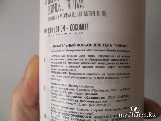Лосьон для тела, о котором рассказываю в обзоре, создан на основе натуральных компонентов. В нем есть витаминчики для питания кожи – Е, В5. Лосьон нежнейший, пахнет кокосовым молочком, которое после остается приятым освежающим ароматом на коже после нанесения. Увлажнение с таким лосьоном для кожи просто обеспечено и надолго. Кожа мягкая, бархатная на ощупь. Аромат кокоса от нее держится еще очень долго. Меня даже спросила знакомая на этот счет. Я с утра приняла душ, нанесла этот лосьон на тело, больше никаких духов и парфюмов не применяла. Пришла к ней на встречу в детский центр, где мы развлекаем наших детей и общаемся. Она и сказала, что от меня приятно пахнет кокосом. Спросила, это не мыло ли такое натуральное кокосовое у меня имеется в домашнем уходе за собой?
