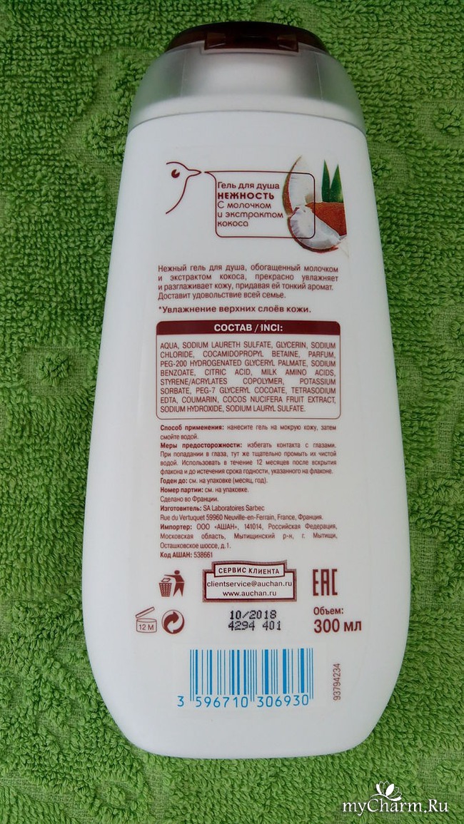 А сейчас я хочу рассказать вам о Геле для душа «Нежность» с молочком и экстрактом кокоса от «Ашан».