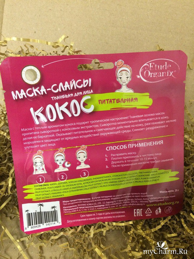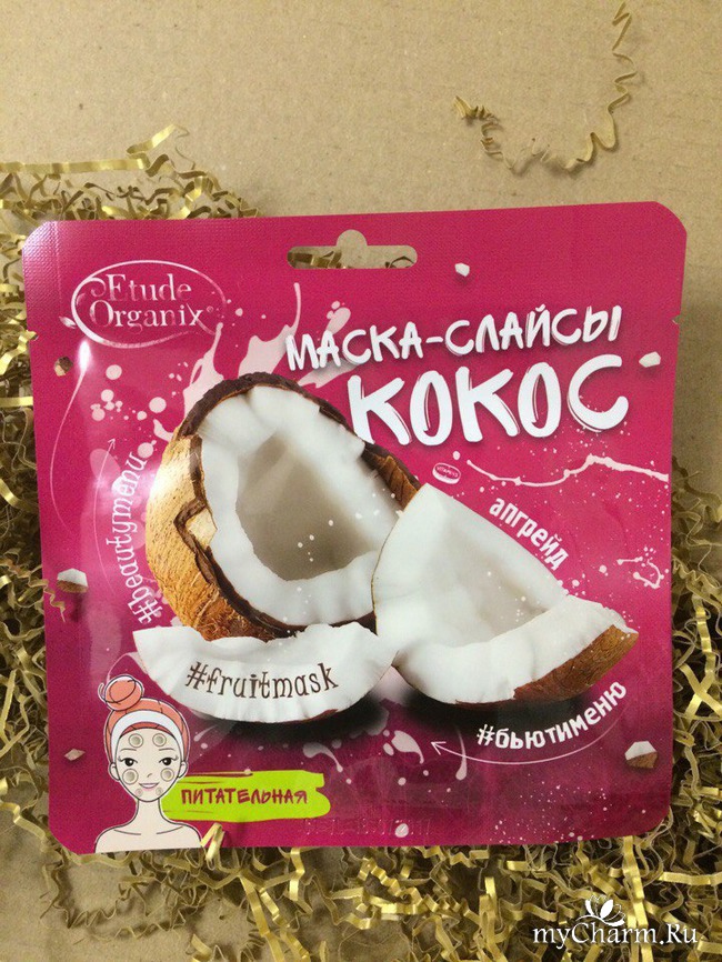А именно сейчас я буду тестировать продукцию от фирмы Etude Organix питательную тканевую маску-слайсы для лица с кокосом.