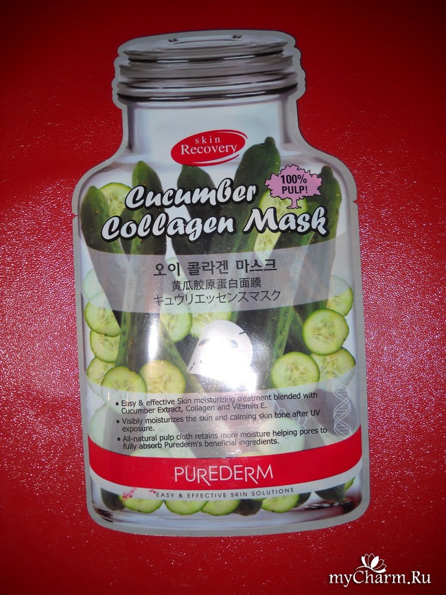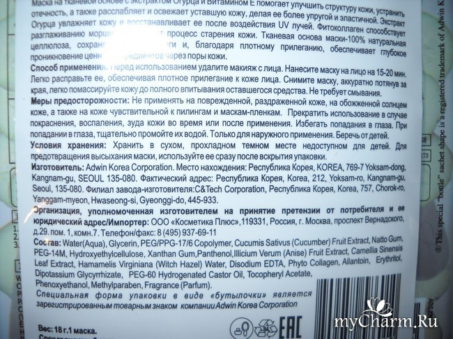 На обратной стороне «бутылочки» имеется наклейка на русском языке с более чем исчерпывающей информацией о товаре и об изготовителе. Как выяснилось, эта масочка на приятной тканевой основе с витамином E и экстрактом огурца помогает не только ликвидировать отечность и существенно улучшить структуру кожи, но и великолепно освежает и расслабляет подуставшую кожу, делая ее более эластичной и упругой. Огуречный экстракт прекрасно увлажняет кожу, а также способствует ее восстановлению после пагубного воздействия ультрафиолета, а фитоколлаген помогает замедлить процессы старения и оказывает неоценимую помощь в непростом деле разглаживания морщин. А тканевая основа масочки выполнена из стопроцентно натуральной целлюлозы, что позволяет сохранить гораздо больше живительной влаги и обеспечить более плотное прилегание маски к коже, что в свою очередь дает ценным компонентам возможность максимально глубоко проникнуть сквозь поры кожи.