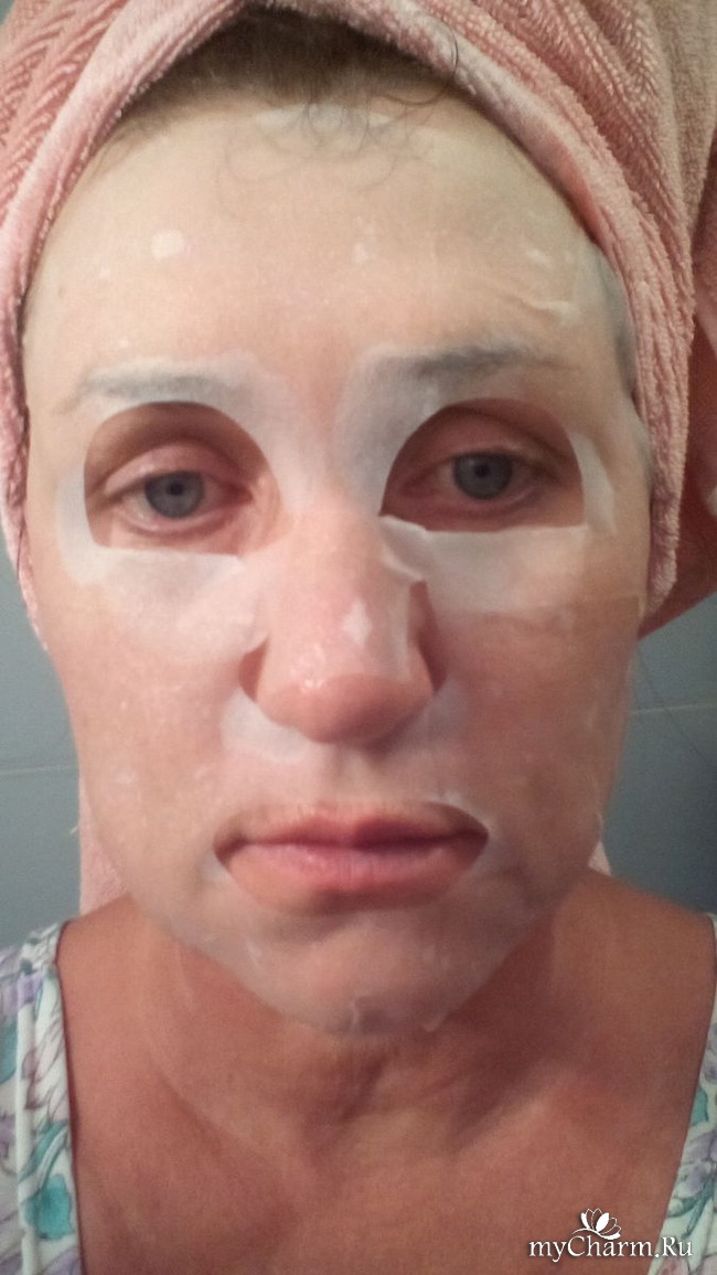 Продержала я маску 20 минут, как и написано на упаковке. За это время она ни капельки не высохла. Поэтому я с удовольствием после снятия маски протерла ею шею, зону декольте и руки.