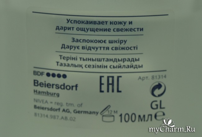 Флакон лосьона 100 мл. При покупке флакон был упакован в картонную коробочку, которая, увы, не сохранилась. Коробочка была выполнена в бело-синем цвете, который присутствует на всех упаковках косметической компании Nivea. Состав лосьона подобран так, чтобы успокаивать кожу после процедуры бритья, он не содержит спирта, который и является причиной сухости кожи.