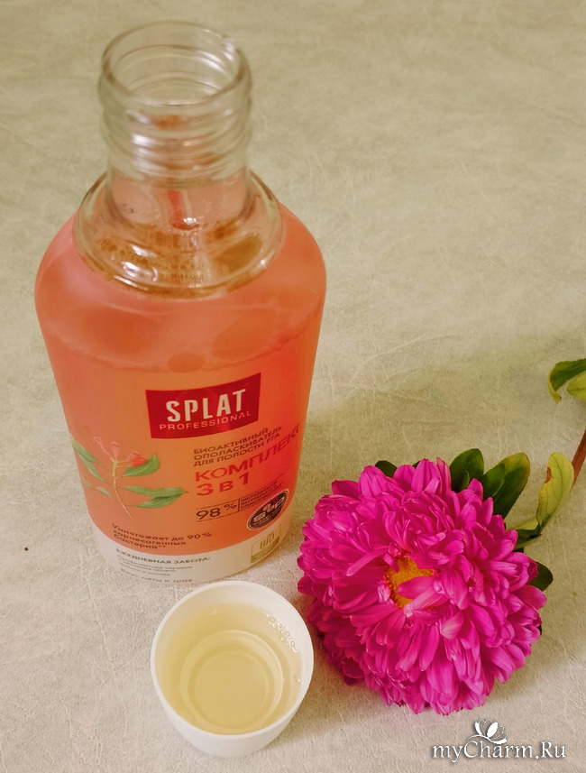 У всей серии ополаскивателей одинаковая тара: пластиковая бутылочка, отвинчивающаяся крышечка которой является ещё и удобным дозатором. Одной крышечки с лихвой хватает на одно полоскание рта. Информация по ополаскивателям указана на упаковке, шрифт мелкий, но читается без труда. Объем средства, залитого в бутылочку - 275 мл, представляет собой прозрачную жидкость с едва заметным оранжевым оттенком. Аромат средства мятный, нежный, очень приятный.