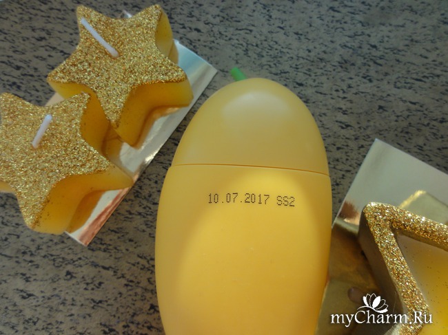 Крем Манго помещен не в обычную тубу, а сделанную в форме манго, яркого фрукта оранжевого цвета и с зеленым хвостиком на крышечке. Туба мягкая, надавливать на нее очень легко для того, чтобы получить тонкую струйку крема из заостренного узкого носика. Крышечка отвинчивающаяся и плотно закрывает тубу. На самой тубе выбита дата изготовления крема – 10 июля 2017 года, но имеется еще и наклейка, которая захватывает и крышечку для сохранения целостности упаковки.