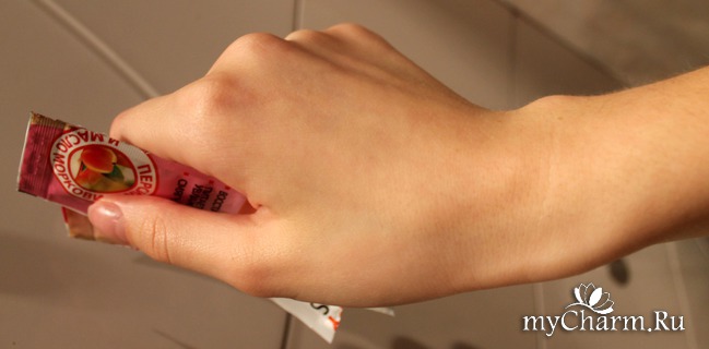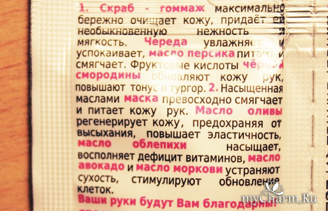 По ощущениям, это примерно треть-четверть пакетика. Знаете, когда я пальцами сквозь упаковку пыталась прощупать эти абразивные частички, они еле улавливались. Вот же было моё удивление, когда оказалось, что их по количеству не мало! Когда массируешь руки, они хорошо ощущаются - не царапают, а приятно действуют. Немного сложновато оказалось смыть этот гоммаж. Ощущается какая-то пленочка, которая всё остается на коже. Я не стала дожидаться её полного смывания - при вытирании полотенцем это ощущение прошло.