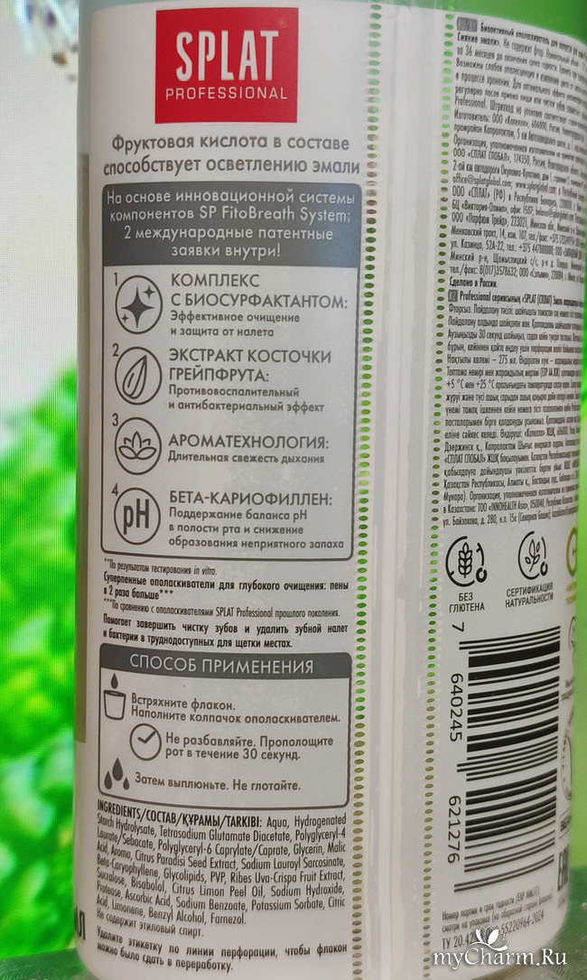 Ополаскиватель представляет собой прозрачную жидкость, приятный мятно – фруктовый аромат.