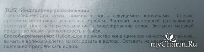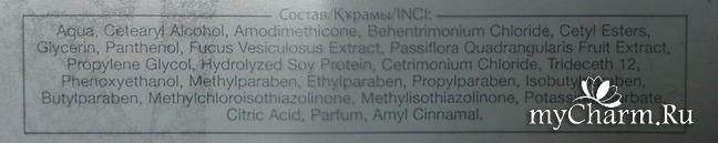 Состав не самый лучший. Конечно, есть здесь привлекательные надписи, в частности – соевые протеины (увлажняют и смягчают волосы, упрощают расчесывание, придают гладкость), экстракт водорослей (разглаживает, также делает более легким расчесывание и моделирование волос), экстракт маракуи (придает волосам мягкость, шелковистость, блеск). Справедливости ради скажем, что полезности сконцентрированы в основном в первой половине списке, что не может не радовать.