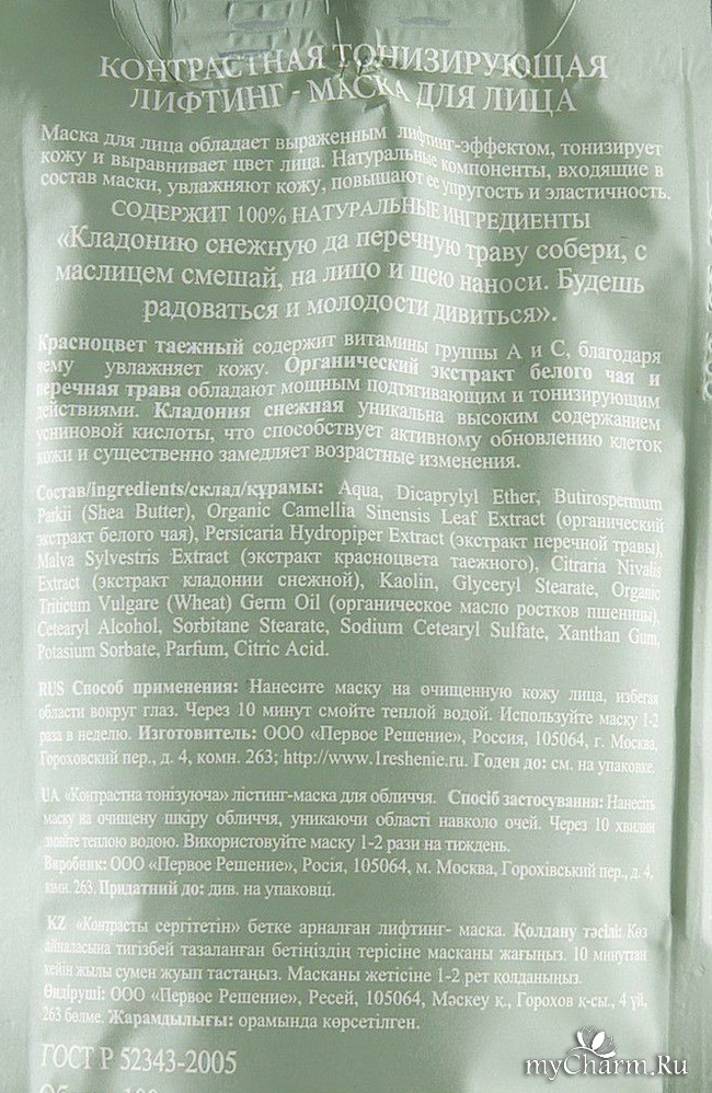 Первый из списка содержит витамины группы А и С, благодаря чему он хорошо увлажняет кожу, ухаживает за ней. Перечная трава и красноцвет обладают сильнейшими подтягивающими свойствами. Действуя в тандеме, они гарантируют коже лифтинг-эффект, что является главным свойством этой маски. А вот кладония снежная делится с кожей усниновой кислотой, которая замедляет возрастное старение кожи и активизирует рост молодых клеточек.