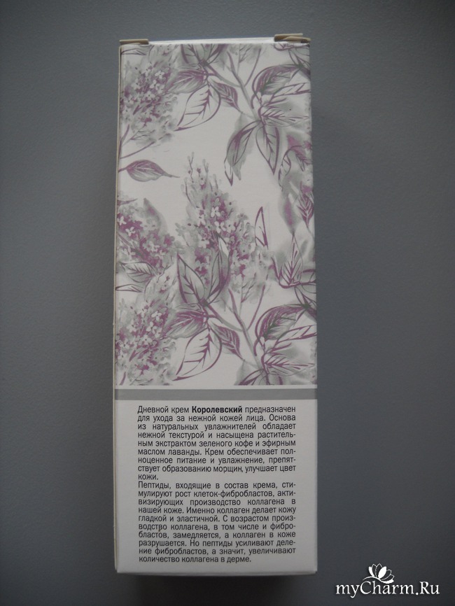 Производитель информирует нас о том, что дневной крем «Королевский» предназначен для полноценного ухода за нежной и уязвимой кожей лица. В основе его формулы можно найти такие ценные натуральные увлажнители, как необычный коньяк маннан и спасительная гиалуроновая кислота – благодаря этому крем может похвастаться удивительно нежной текстурой. Кроме того, его формула обогащена эфирным маслом лаванды и экстрактом любимого многими зеленого кофе. Обеспечивая коже полноценное увлажнение и питание, это замечательное средство заметно улучшает цвет кожи и всячески препятствует появлению ненавистных морщин.