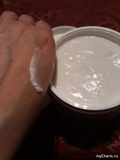 Крем наношу на влажную чистую кожу, сначала слегка густоват, но под действием тепла кожи, тает на ней и не оставляет жирного следа. Очень шелковистый и нежный, словно сливочное облачко, легло на кожу и растаяло.