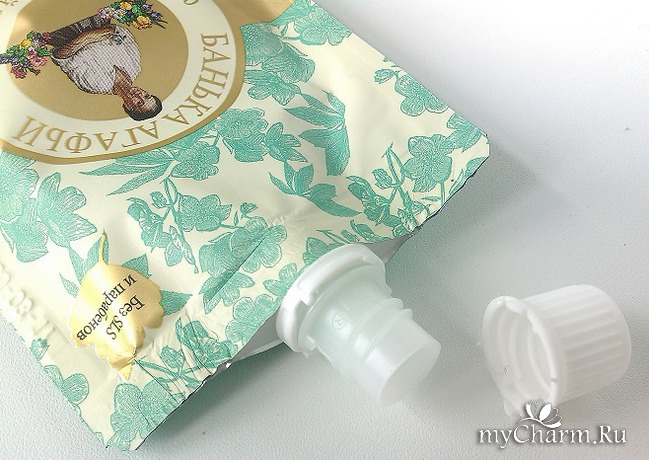 На лицевой стороне мы видим традиционный профиль бабушки - визитную карточку бренда Рецепты бабушки Агафьи. Упаковка имеет нежно-мятный цвет. Так же есть надпись, что используются 100% натуральные ингредиенты (разнообразные травы), нет парабенов и SLS.