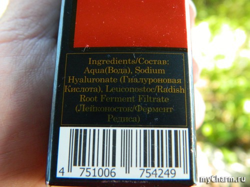 Что же представляет собой новый продукт от DNC? Заглянем в состав. Он короток - всего три компонента: вода, гиалуроновая кислота и фермент редиса, выступающий в роли консерванта.