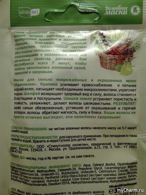 В составе данной маски присутствуют экстракты крапивы, шишек хмеля, шалфея.