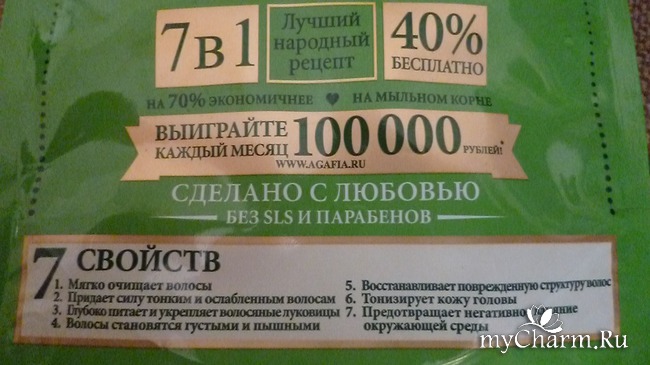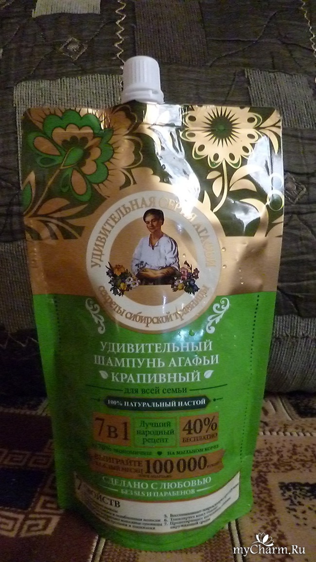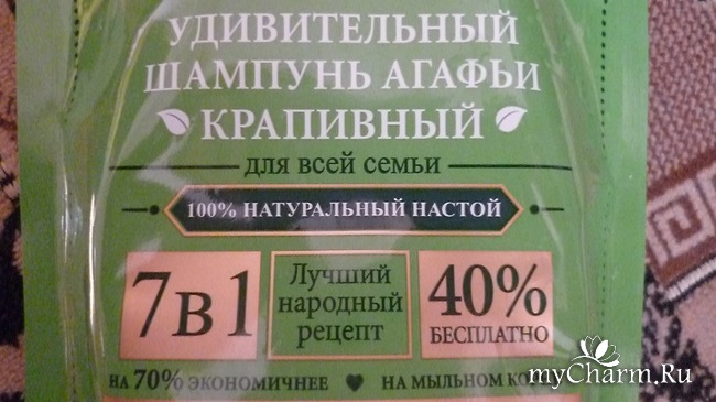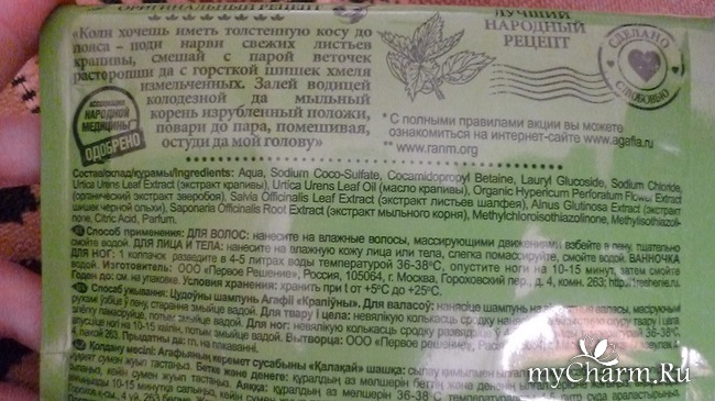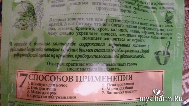 На упаковке можно прочитать множество интересной и полезной информации о пользе крапивы для красоты и здоровья и даже оригинальный рецепт приготовления домашнего шампуня на основе этого замечательного растения.