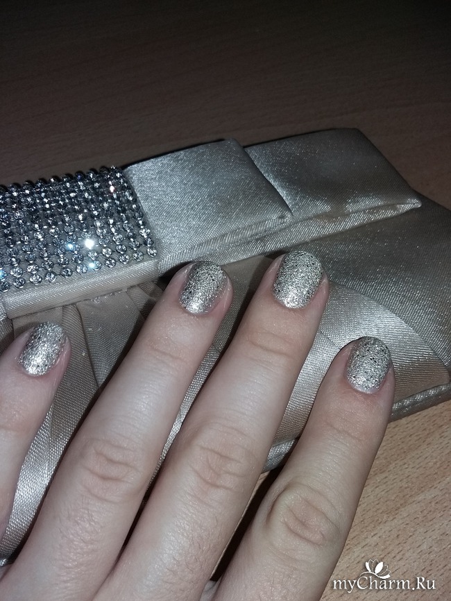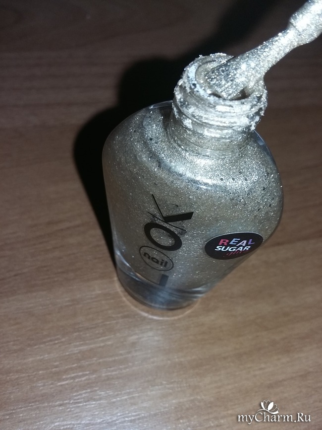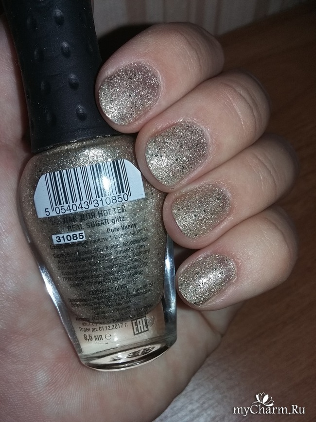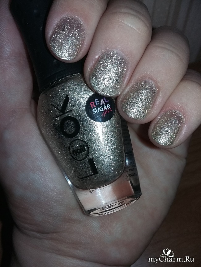 В магазине я не обратила внимания на маленькую наклейку с надписью Real Sugar, поэтому о его необычной текстуре узнала уже непосредственно при нанесении. На ногтях красиво заиграл и заискрился золотой песочек с серебристым глиттером. Уже одного слоя было достаточно для блестящего эффекта. Но для более плотного покрытия, я решила нанести двойной слой. Один за другим я прокрасила все ногти. Результат мне очень понравился - маникюр получился нарядным, но в то же время неброским, что можно носить его и днем, да и в любое время года. На ощупь лак "шершавый" и кажется матовым, когда на руки не попадает свет. На солнышке же играет, искрится и переливается.