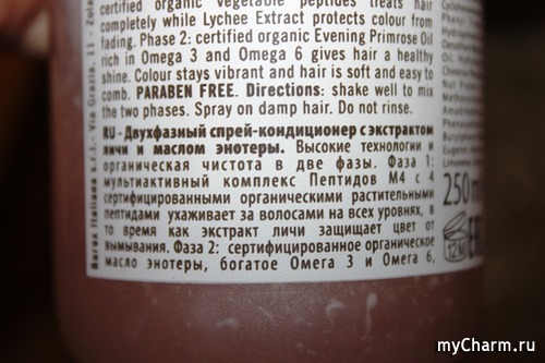 Двухфазные средства очень привлекательны и желанны в арсенале красоты многих женщин. А все потому, что они выполняют сразу несколько функций и удобны в применении. Например, в данном варианте фаза №1 включается в себя мультиактивный комплекс пептидов М4 ( т. е. восстановление, защита и уход под контролем сразу 4 пептидов, имеющих органический сертификат) и экстракт личи, который препятствует вымыванию цвета из структуры волоса. Фаза №2 содержит органическое масло энотеры (источник важных жирных кислот Омега 3 и Омега 6), восстанавливающее поврежденные волосы, кондиционирующее и придающее здоровый блеск.