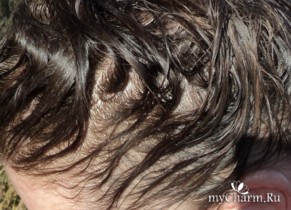 Затем нанести на волосы, прядь за прядью, от корней до кончиков по всей длине. Процесс этот не совсем эстетичный, его заснять не удалось. Но могу констатировать, что краска оказалась густой, не течет. При попадании на кожу не щиплет. На волосах постепенно становилась коричневатой.