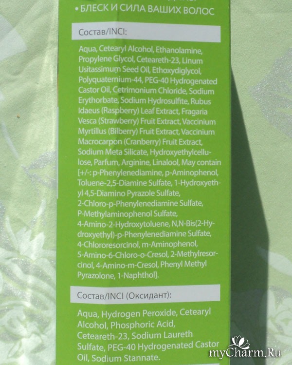 В составе Оксиданта – гидрогенизированное касторовое масло. В списке ингредиентов краски тоже кое-что интересненькое. Например, несколько видов масел и экстрактов: