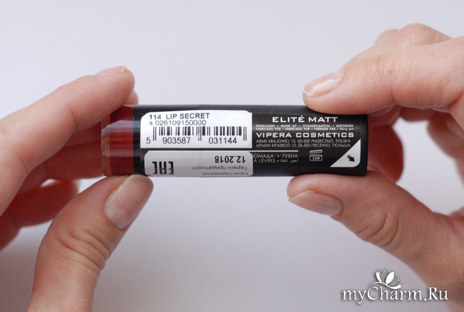Пожалуй приятно, когда дизайн упаковки совпадает с функциями самого продукта. Vipera к этому относится строго. Матовый колпачок заявляет об эффекте самой помады. А в этом сезоне, если вы помните, матовые губы в особом почете. Наклейки занимают 30% площади маленького тюбика, там мы можем узнать цвет, название коллекции, сроки годности, состав.