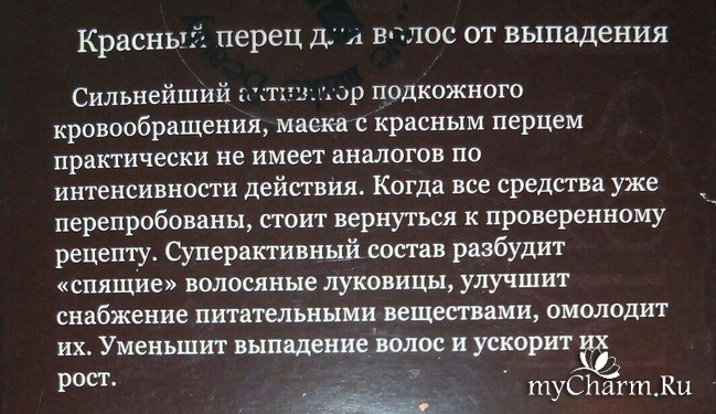 Делаю вывод, что маска Красный перец положительно влияет на состояние волос и кожи головы в целом. Маска усиливает кровообращение кожи, тем самым укрепляет волосяные луковицы. Уже после двух применений виден результат.