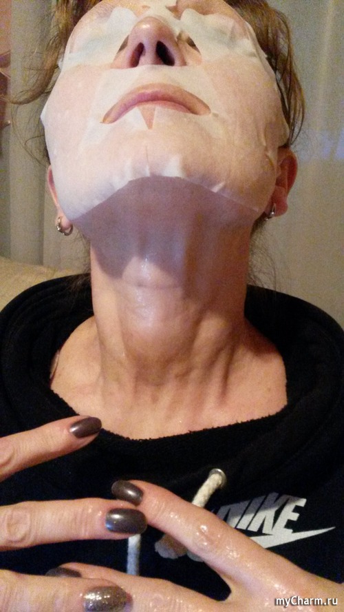 На чистую кожу аккуратно распределяю маску. Отличное прилегание, приятная прохлада. Никакого стягивания, зуда. Остатки жидкости нанесла на шею, руки, драгоценный эликсир не должен пропасть. 20-30 минут можно расслабиться, помечтать о приятном.