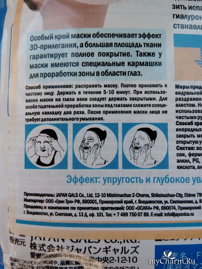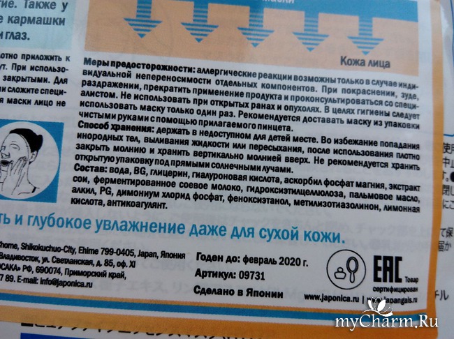 Тканевые маски являются детищем японского бренда. Они аккуратно уложены в плотный непрозрачный пакет, с обратной стороны которого имеется дополнительная этикетка-наклейка, повествующая о продукте на русском языке. Дополнением к пакету служит специальный пластиковый пинцет, позволяющий добыть маску, не притрагиваясь руками к остальному содержимому.