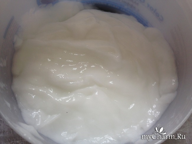 Маска белого цвета, очень густая. Консистенция напоминает что-то между кремом и гелем с приятным легким ароматом. Очень хорошо распределяется по волосам, легко скользит, не течет.