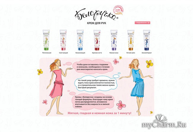 Сайт бренда и упаковка считают, что главной «фишкой» Белоручки» является тающая формула. Это означает, что крем впитывается мгновенно, и даже на глубокое проникновение средства потребуется не больше минуты.