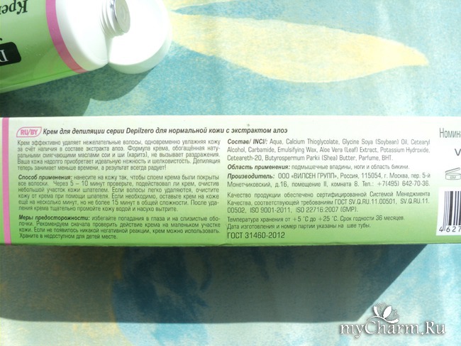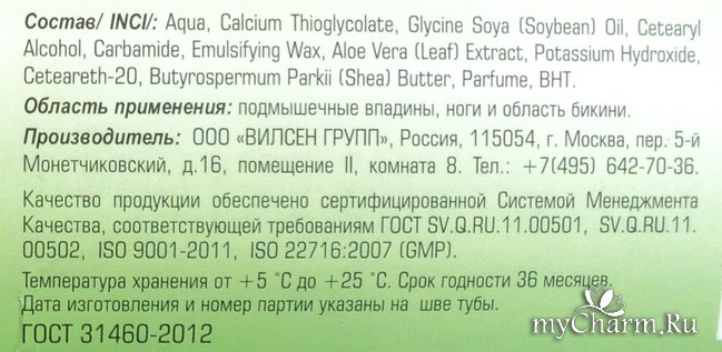 В составе есть экстракт листьев алоэ вера, масло ши, масло сои. Активным депил-ингредиентом крема является Calcium Thioglycolate. Он может вызывать аллергические реакции, а при очень частом применении может повлиять на репродуктивную функцию и на нервную систему.
