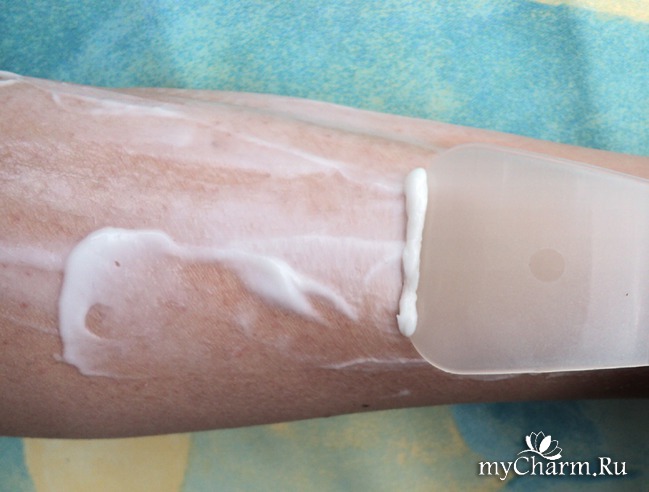 Соскребаю через 5 минут. Крем не затвердел, остался таким же податливым, удаляется легко, в одно движение. Нужно именно соскребать шпателем, а не смывать, потому что крем разрушает волоски, но не удаляет луковицу, и именно механическое воздействие на ослабленные волоски удаляет их.