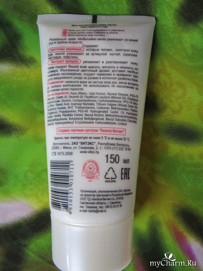 Люблю, когда у меня много кремов, когда есть выбор средства, чтобы пользоваться под настроение, когда есть возможность чередовать уходовую косметику с целью предупреждения эффекта привыкания. Поэтому почти каждый мой поход в магазин, как правило, заканчивается покупкой крема или геля для рук с активным увлажнением. Сегодня хочется рассказать об одном интересном средстве из моей копилки уходовой косметики для рук. Знакомьтесь: Крем для рук Разглаживание и укрепление "Кашемир и белая орхидея", созданный известным научным центром "Белита-Витэкс".