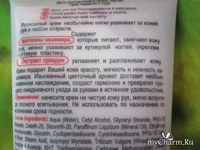 Основными действующими компонентами крема, как видно из названия, являются кашемир (точнее — протеины кашемира) и экстракт белой орхидеи.
