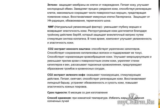 Оформление упаковки, как всегда у данного бренда, выполнено без излишеств: фирменная наклейка с логотипом бренда, информация о составе, дате производства и сроке годности. Сразу скажу, что срок годности моего крема уже истёк, так как он был изготовлен в октябре месяце 2015 года, лишь после моего заказа. Само средство у меня за это время тоже закончилось. А впечатления остались. Ими я и хочу поделиться ;)