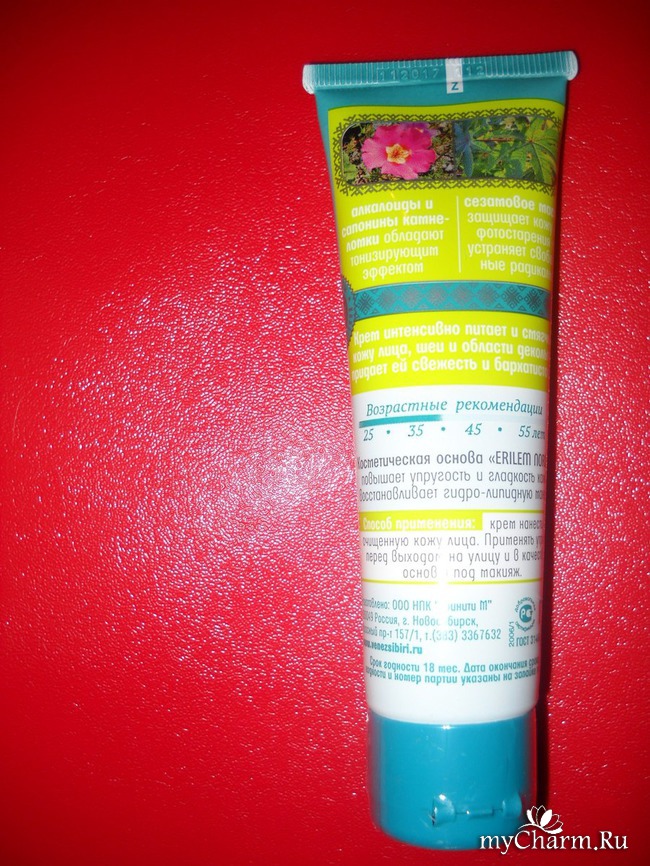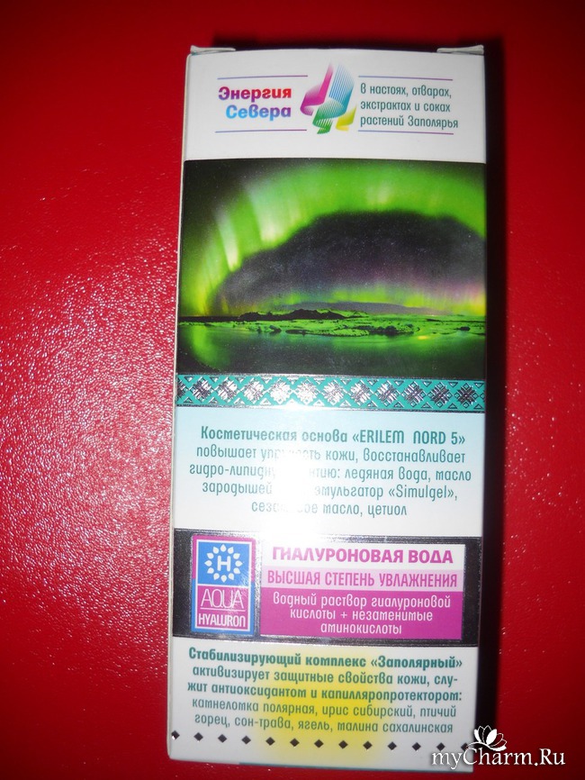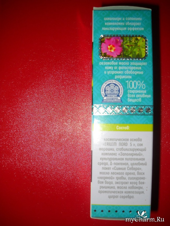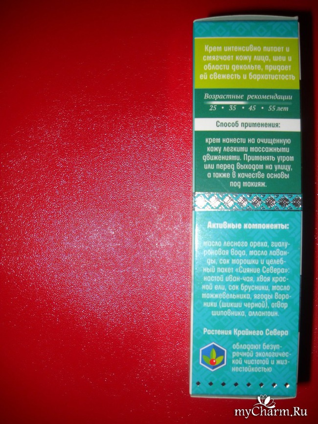 А еще в составе крема найдутся сок морошки, целебный пакет «Сияние Севера» (состоящий из таких ценных компонентов, как сок брусники, хвоя красной ели, настой иван-чая, отвар шиповника, ягодки вороники, масло можжевельника и аллантоин), цитрат серебра, лавандовое масло, Д-пантенол, культурная питательная среда, экстракт ягодок боярышника, воск «ледяной» травы, масло лесного ореха и ароматическая композиция. Просто прелесть!