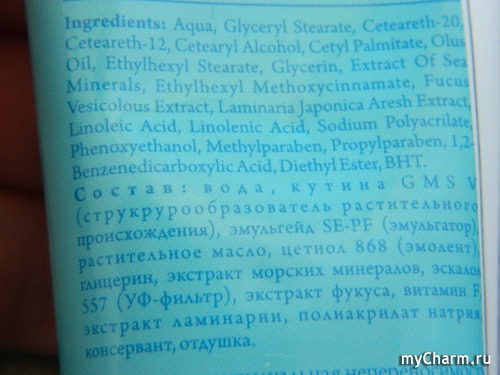 Крем белого цвета, не жирный, текстура лёгкая. Аромат самый что ни есть свежий – утреннего моря, когда воздух ещё не пропитан солнечными лучами. Вдыхаешь, и сразу вспоминаешь утренние прогулки по кромке моря…