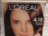 Упаковка из плотного картона. На лицевой стороне фотография симпатичной девушки, указан номер 4.15, цвет-морозный шоколад. На обратной стороне есть инструментальный тест - это фотографии трех оттенков волос до окрашивания и после. Написано - новая обогащенная формула. Тройная защита обеспечивается благодаря трем компонентам: про-кератину, керамидам и коллагену. Про-кератин восстанавливает и укрепляет волосы. Керамиды разглаживают и защищают волосы. Коллаген наполнят волосы силой и уплотняет их.