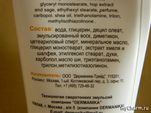 Но присутствуют и растительные ингредиенты. В частности, экстракты хмеля (увеличивает тургор кожи и повышает её эластичность) и шалфея (оказывает дезинфицирующее и успокаивающее действие, разглаживает кожу), а также масло ши (интенсивное смягчение, увлажнение и питание).