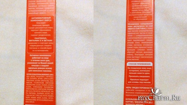 Рассмотрим коробочку ближе. С боковых сторон приведены все свойства этого крема-праймера, его состав, штрих-код, срок годности, способ применения и меры предосторожности. Огорчу любителей натурального состава: он здесь очень даже ненатуральный. И метилпарабен с пропилпарабеном тоже имеются. Из полезного есть пантенол, витамин Е (токоферол ацетат) и бетаин, свойства которых тоже прописаны на упаковке. Не мог не заинтересовать антимикробный компонент Zinc PCA.